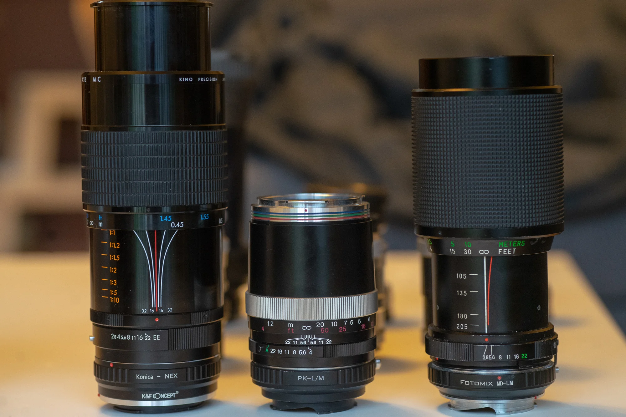 Left to right: 1) Kiron Kino Precision Macro 105mm f/2.8 ca. 1980 from Craigslist in Pittsburgh, PA 2) Voigtlander APO-Lanthar 180mm f/4 2003 from eBay 3) Vivitar Macro 75-205mm f/3.8 ca.1979 from Goodwill