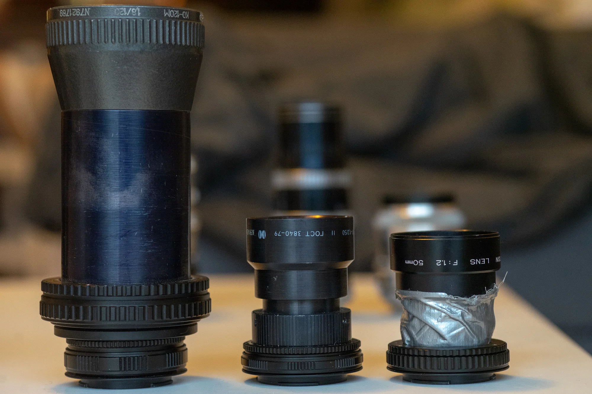 Left to right: 1) KO-120M 120mm f/1.8 1979 from eBay 2) 16KP 50mm f/1.2 date unknown from eBay 3) Elmo 50mm f/1.2 date unknown from Creative Reuse in Pittsburgh, PA